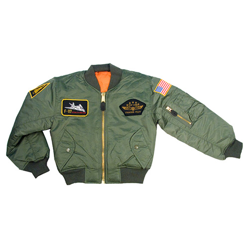 Dziecięca kurtka lotnicza typu bomber w stylu Top Gun, z stylowymi naszywkami.