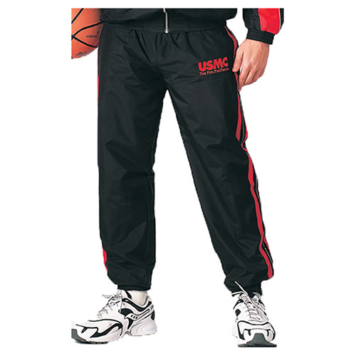 Czerwony haftowany napis USMC THE FEW, THE PROUD. CZARNE spodnie dresowe z czerwonym paskiem odblaskowym. Ściągacz w pasie. Materiał: poliester/bawełna. Więcej informacji