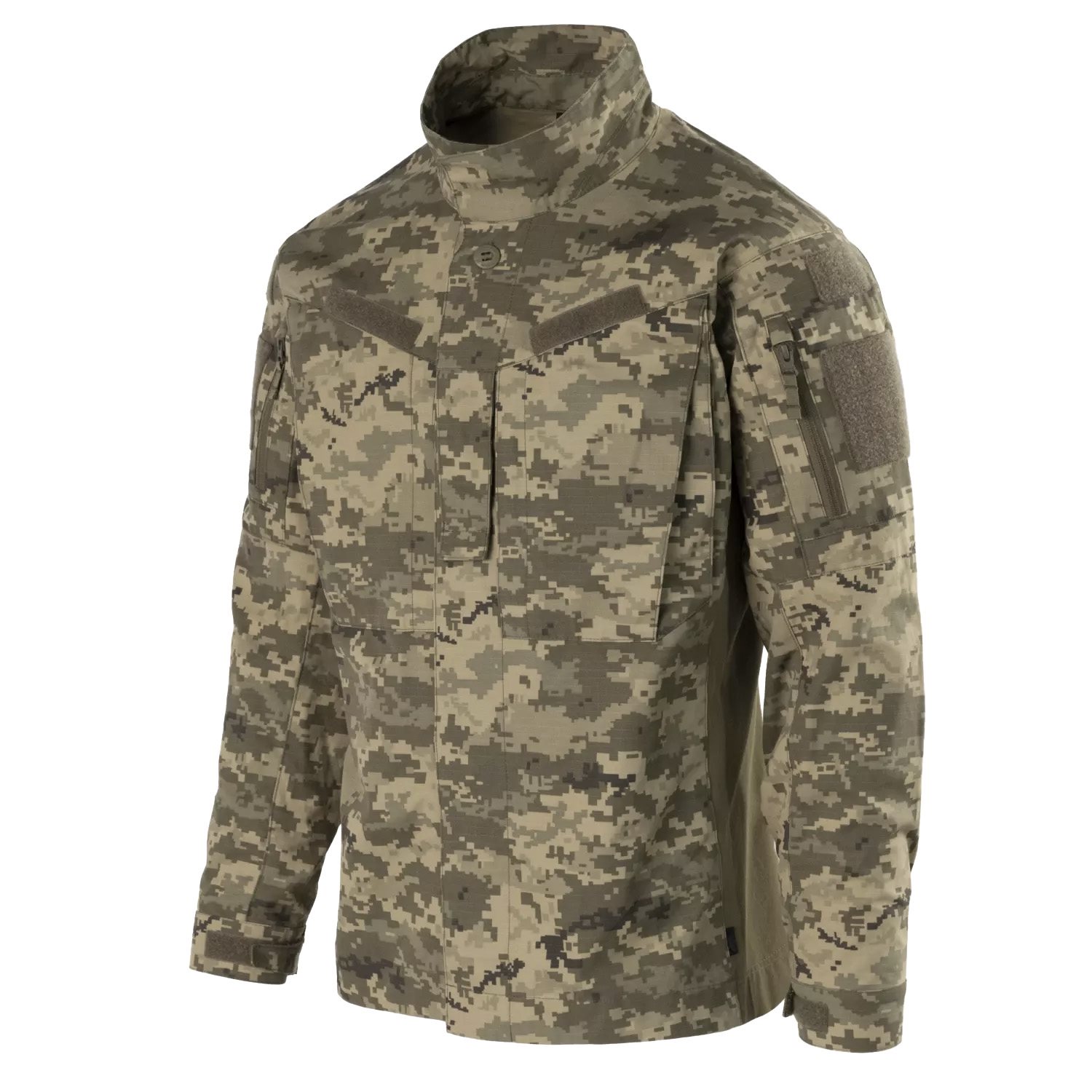 Cała bluza ma dopasowany, anatomiczny krój, idealny do całodziennego komfortowego noszenia. Klasyczny kołnierz można w mgnieniu oka przekształcić w stójkę, którą można bardzo szybko zapiąć przy szyi za pomocą rzepów. Zapięcie całej bluzy rozwiązano za pomocą guzików przymocowanych do bluzy za pomocą mocnej taśmy. Dzięki temu guzik nie wyrywa się ani nie odrywa. Na piersi znajdują się również dwie płaskie, rozszerzalne kieszenie, nad którymi znajdują się szerokie paski z rzepem, odpowiednie na identyfikatory itp.
