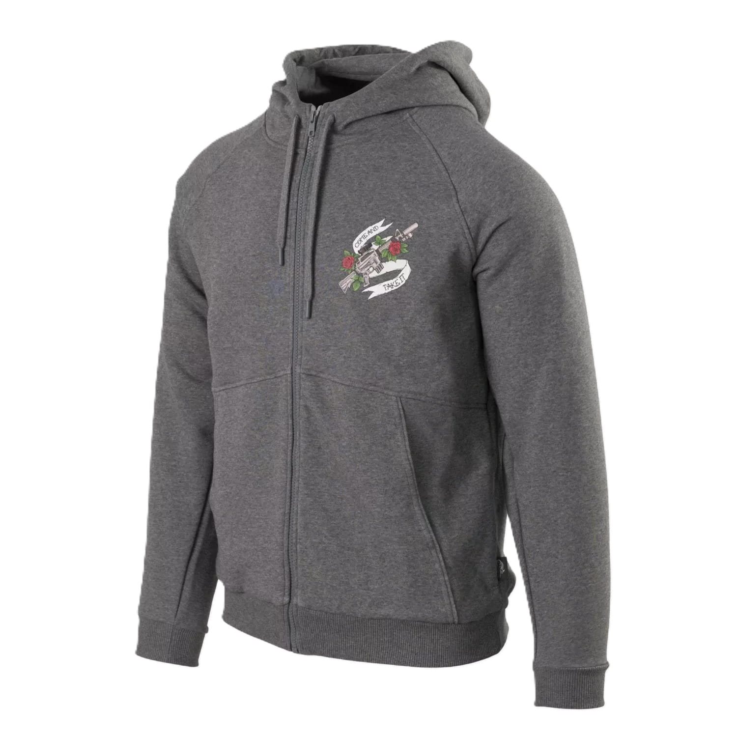 Lekka bluza z kolorowym nadrukiem, zamkiem błyskawicznym i kapturem od polskiego producenta HELIKON. Wykonana jest z mieszanki 65% bawełny i 35% poliestru. Zapinana jest na centralny zamek błyskawiczny. Bluza posiada dwie boczne kieszenie i kaptur, który można regulować za pomocą sznurka. Na piersi i na plecach znajduje się kolorowy nadruk „Come and take it”.