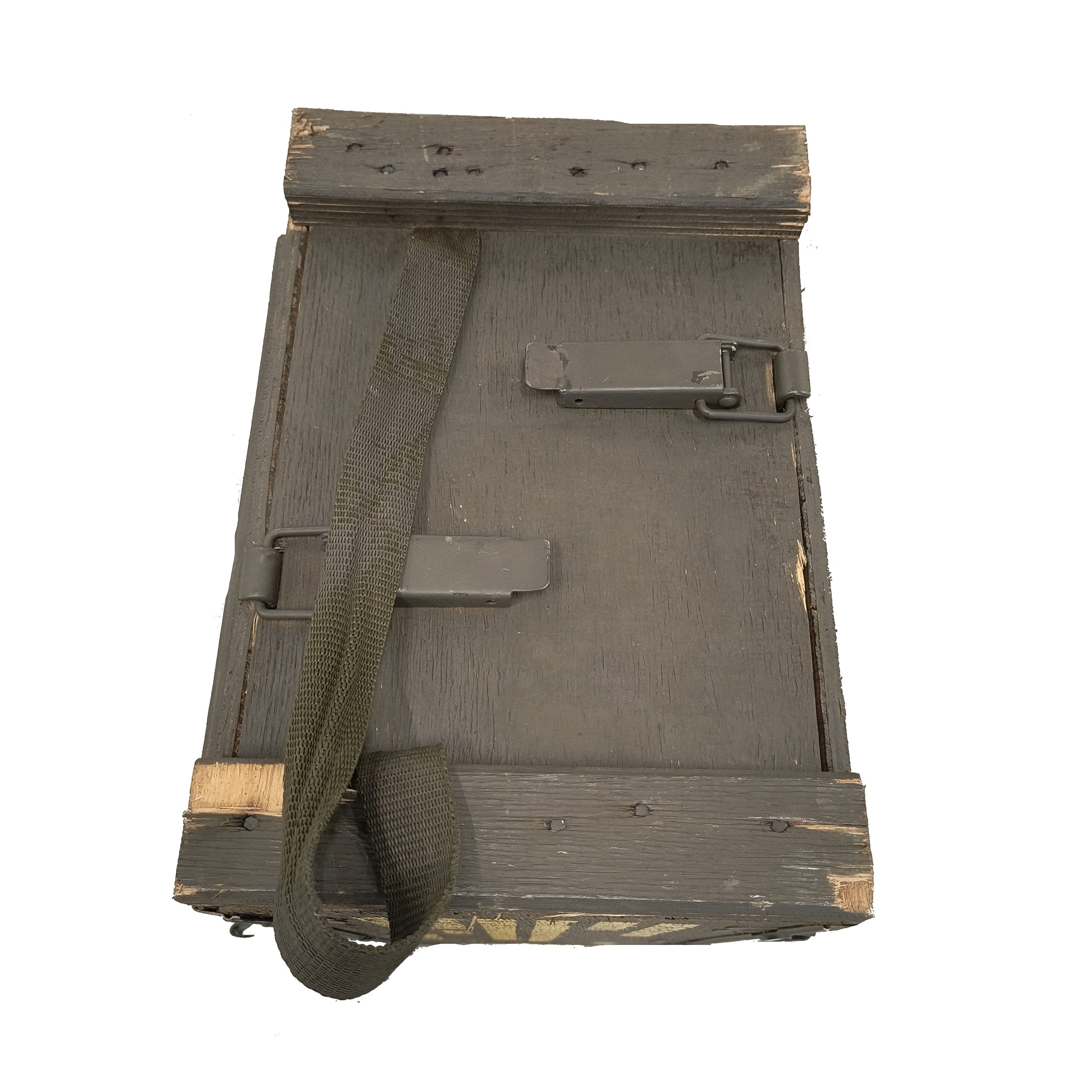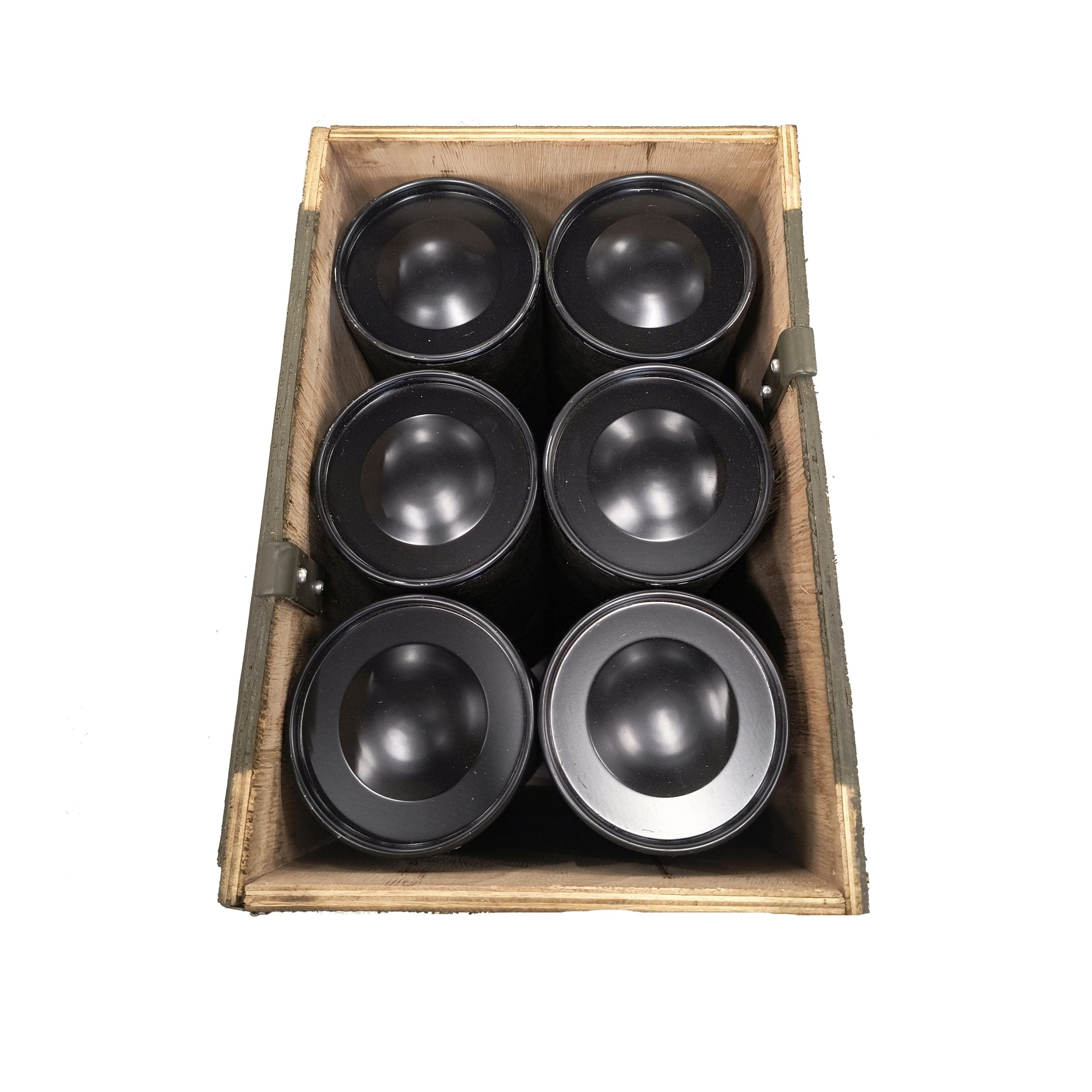 Drewniana skrzynia na miny moździerzowe odłamkowe 81 mm, w tym 6 sztuk kaset, używana.