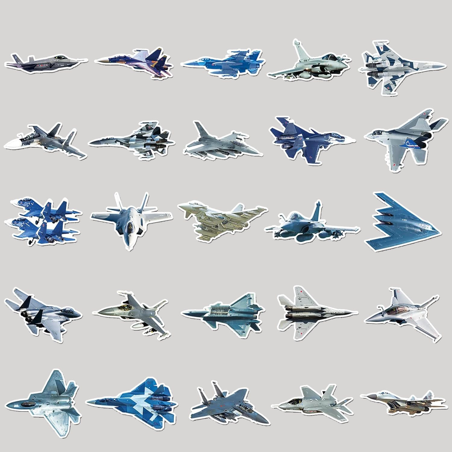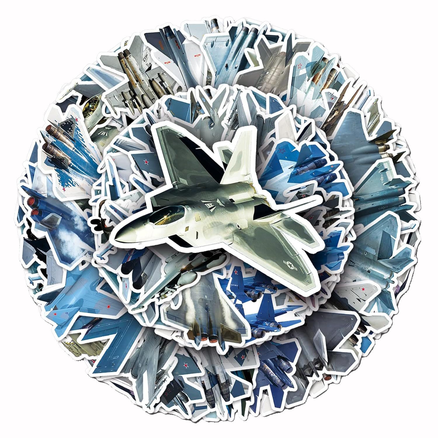 Zestaw 50 kolorowych naklejek z samolotami wojskowymi.