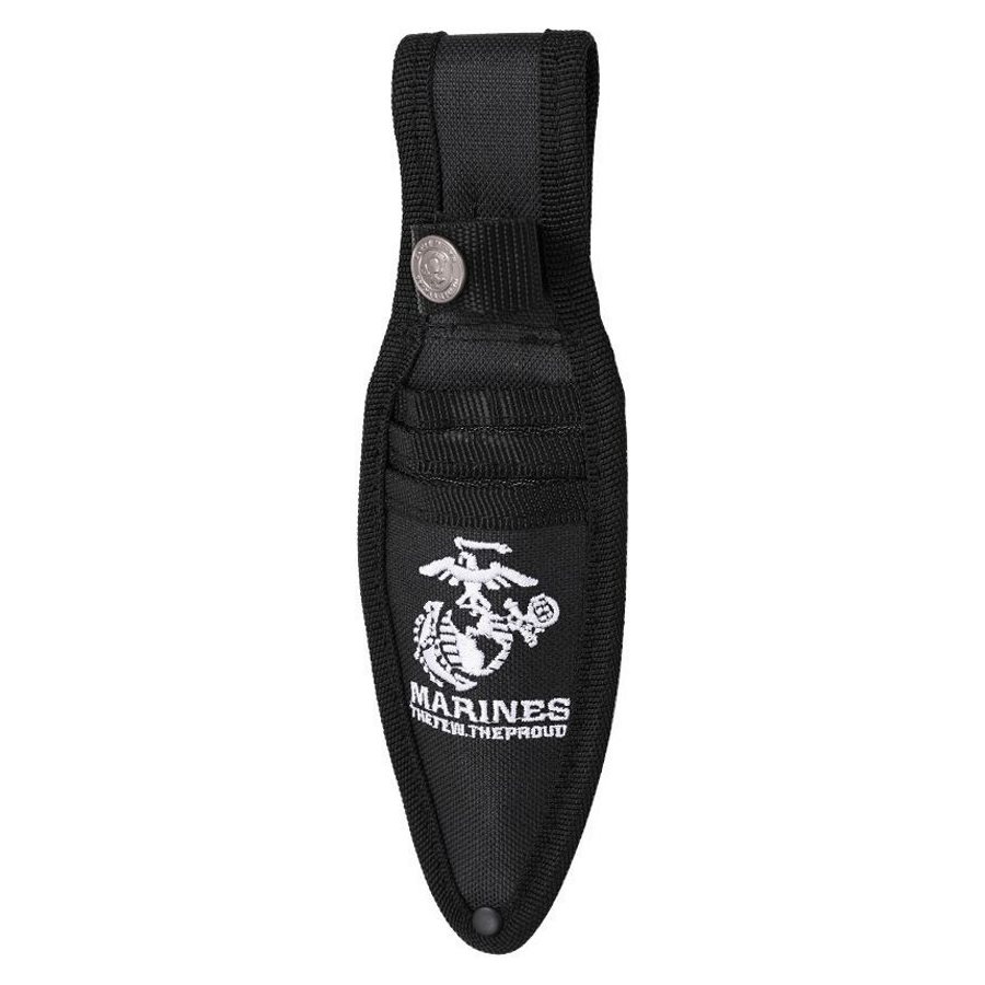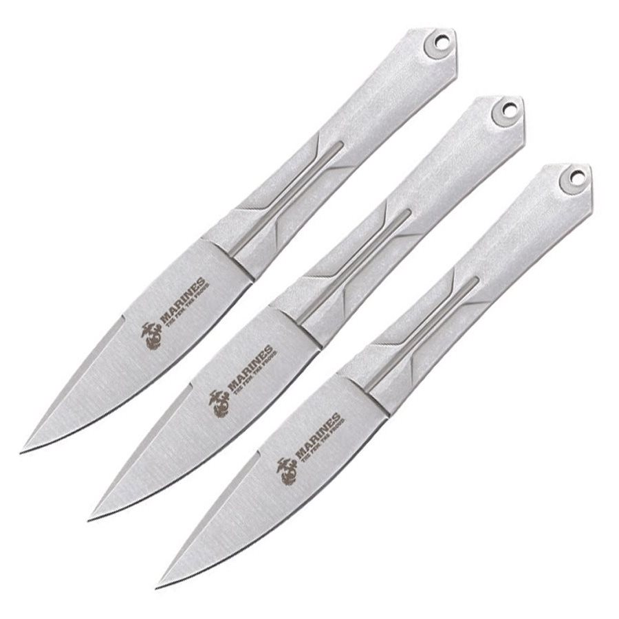 Zestaw trzech doskonale wyważonych noży ze stali nierdzewnej z oficjalnie licencjonowanym logo USMC. Noże są wykonane z jednego kawałka stali nierdzewnej z wykończeniem typu „stonewash”. Ostrze noży jest gładkie, a ich czubki są wyjątkowo wąskie, co zapewnia maksymalną penetrację. Na końcu każdego noża znajduje się otwór do przewleczenia linki zabezpieczającej. Do zestawu dołączono nylonowe etui na pasek z zabezpieczeniem za pomocą pasków z zatrzaskami.