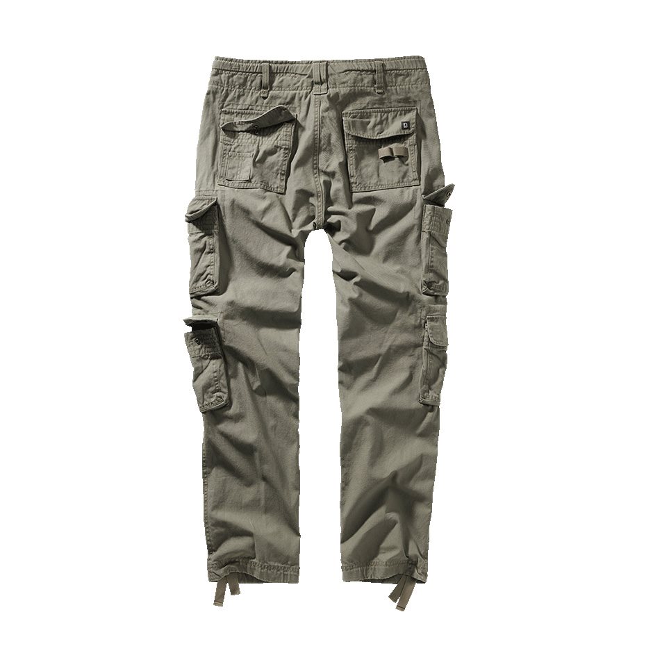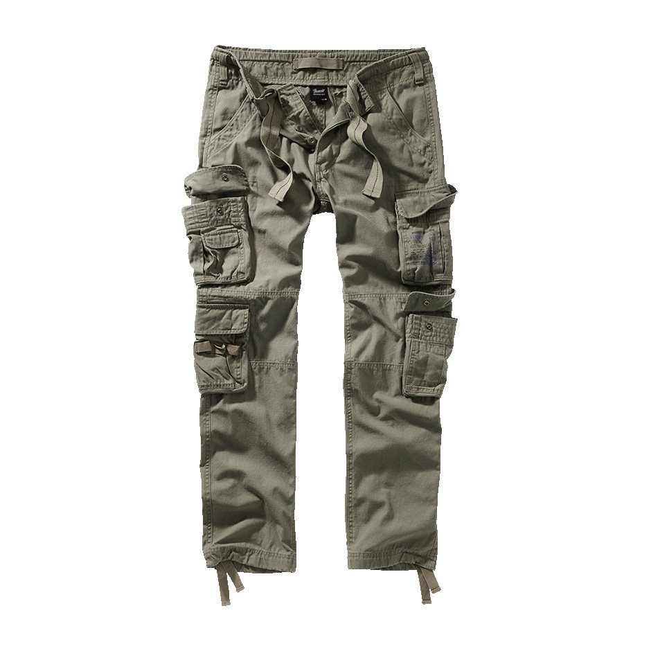 Wygodne spodnie z kieszeniami o kroju slim, wykonane z wytrzymałej bawełny w stylu vintage. Spodnie zapinane są na guziki, a w razie potrzeby pas można ściągnąć za pomocą sznurka. W pasie znajdują się dwie klasyczne kieszenie na ręce, które na udach i kolanach uzupełniają cztery dodatkowe kieszenie typu sakwojka z klapką zapinaną na zatrzaski. Mankiety nogawek można ściągnąć za pomocą materiałowych pasków.