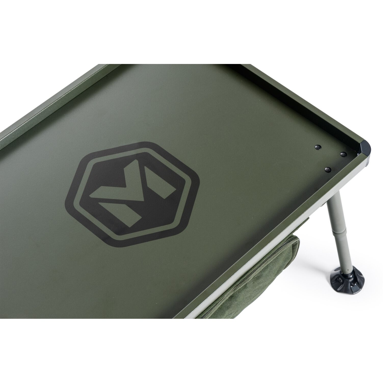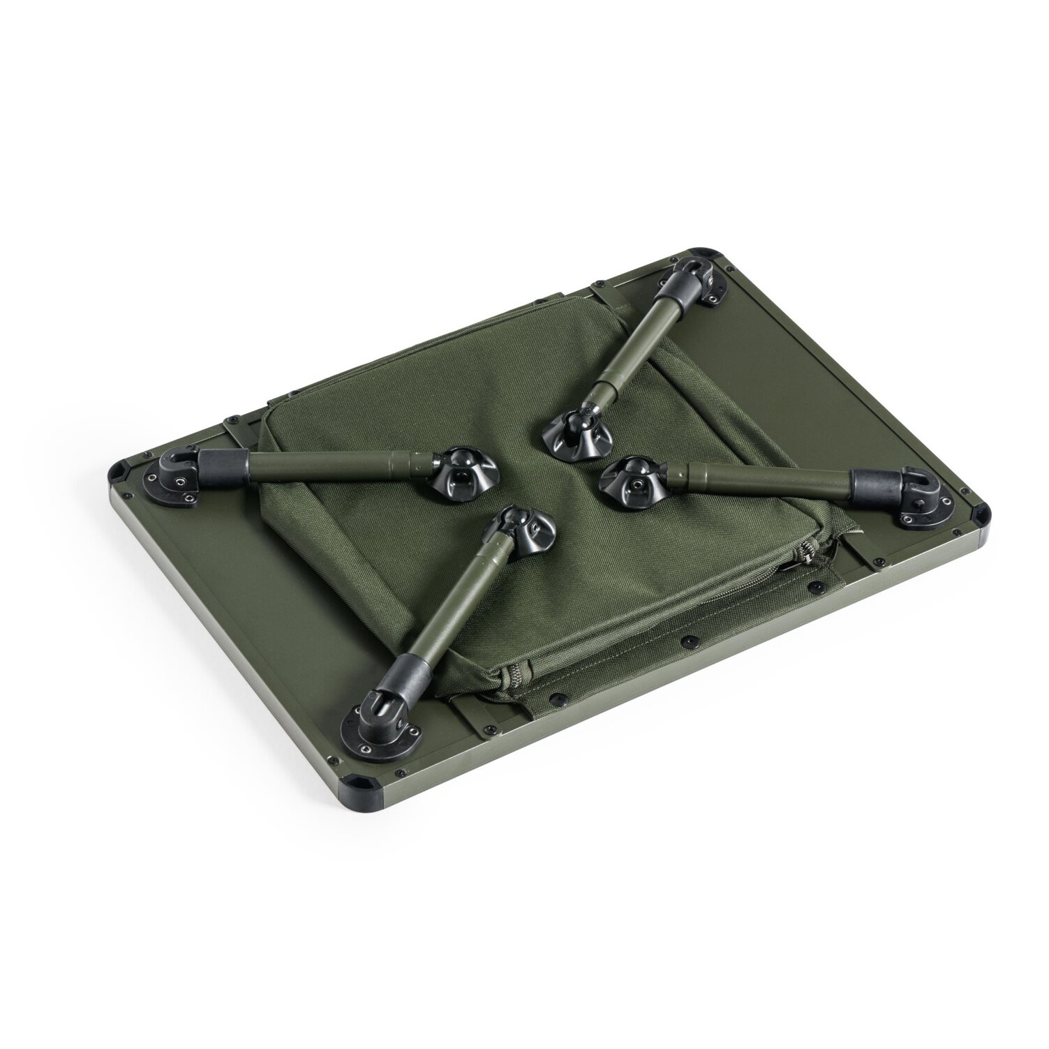 Nowo zaprojektowany stolik biwakowy o większych rozmiarach z miejscem do przechowywania pod blatem. Miejsce do przechowywania jest zamykane na zamek błyskawiczny, a jego dno jest wzmocnione lekką, ale wystarczająco sztywną płytą. Całkowicie metalowa konstrukcja głównego blatu gwarantuje sztywność i długą żywotność. Teleskopowe nogi są wyposażone w luksusowe odchylane stopki i system szybkiej blokady wysuwu. Pozwalają one również na ustawienie stolika na ponadstandardowej wysokości. Bardzo łatwe jest również rozkładanie i składanie nóg. Stolik jest dostarczany w praktycznej torbie transportowej z uchwytami do przenoszenia.