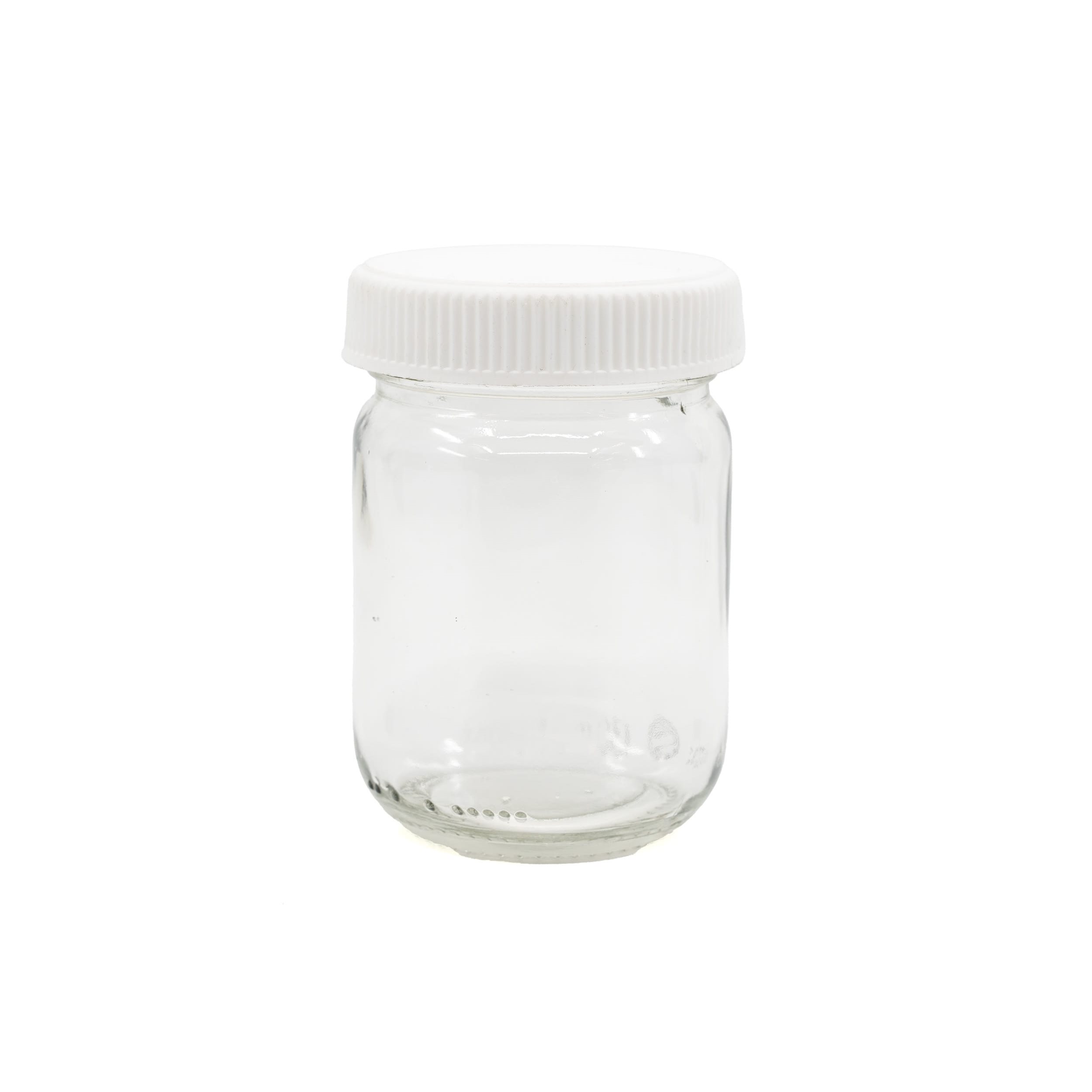 Szklana butelka z szeroką szyjką 130 ml z białym plastikowym nakrętką